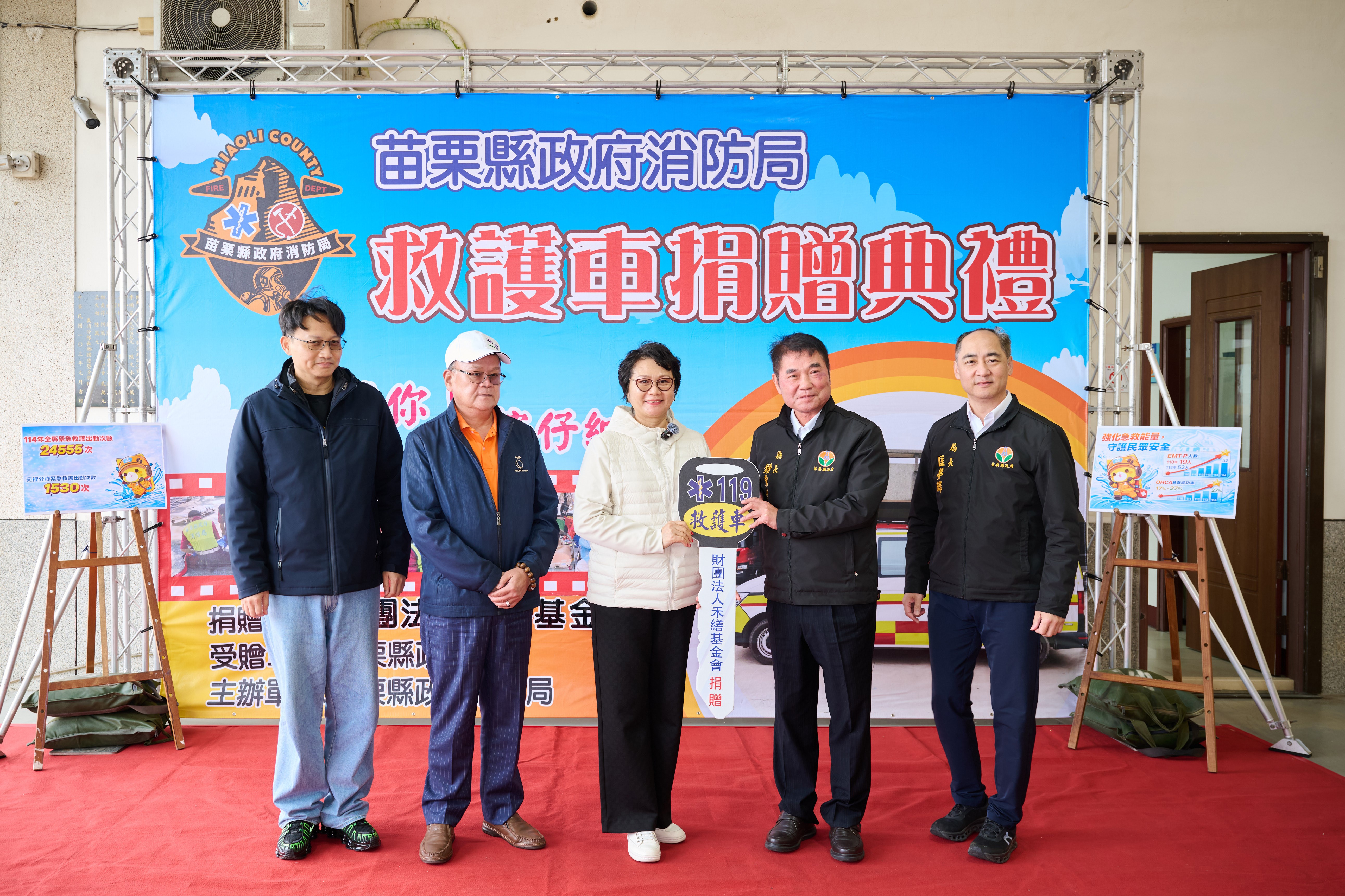縣長上任後非常重視緊急救護工作,特責由消防局積極培訓高級救護技術員(EMT-P),並擴充配置在各鄉鎮市消防分隊,提升救護品質;今天的捐贈,不只是基金會的善舉,更是整個社會共同守護生命的象徵。縣長相信,政府、民間與消防單位一同努力,苗栗縣一定能打造更安全、更有溫度的生活環境。